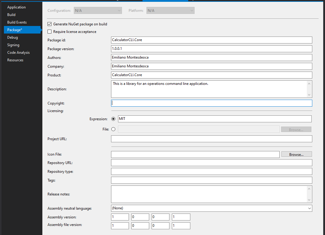 Now go to the project properties and then Package, you will see a lot of information regarding the package like the package version, authors, descriptions and more.