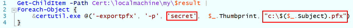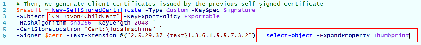 En esta ocasión, además de marcar el campo “CN” para llamarlo como queramos, veríais que también hay marcada una sección de script. Básicamente, lo que haría sería extraer el “thumbprint” (o “huella digital”) para, con el tercer script, exportarlo a un equipo distinto al que estamos almacenando el certificado de cliente. Os podréis imaginar que tal técnica nos iba a permitir generar certificados para los equipos de nuestra organización.