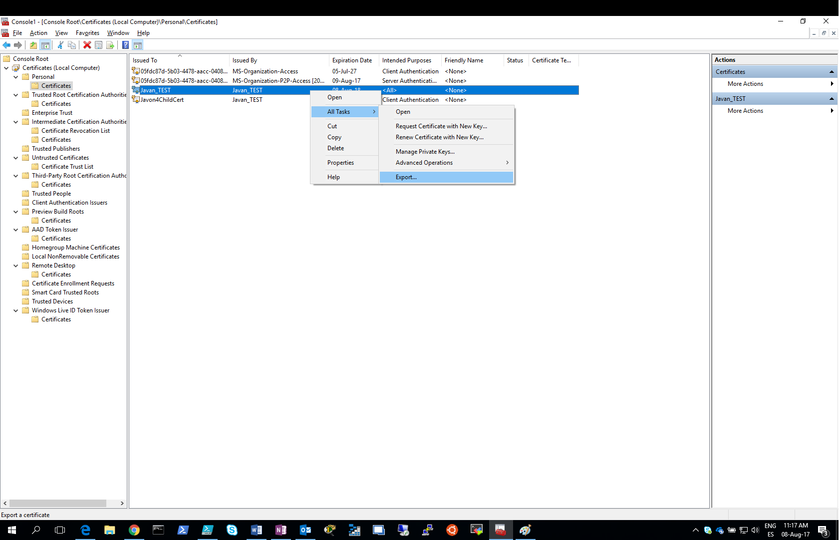 Hecho todo lo anterior, íbamos a proceder a exportar tanto el certificado autofirmado al servicio de Azure como el certificado cliente a otro equipo.