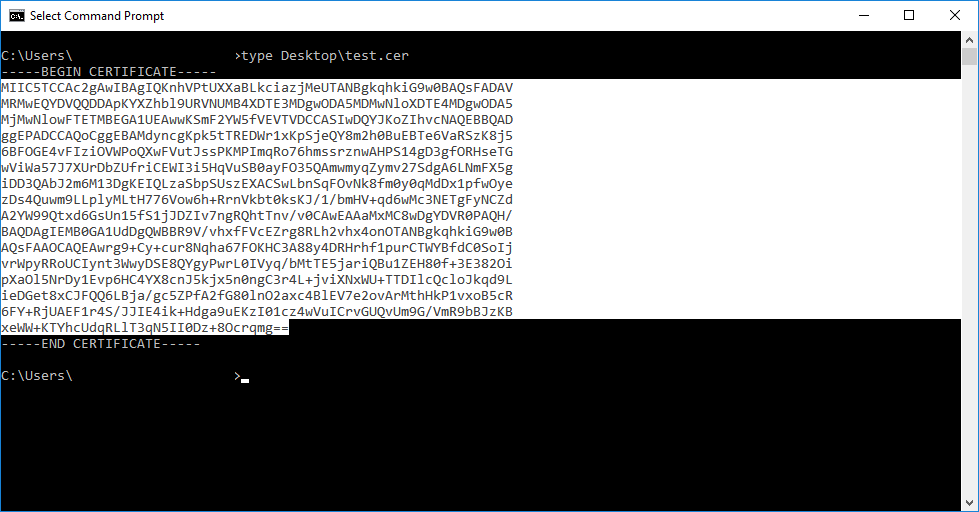 Como podréis ver, lo que íbamos a hacer era exportar primero el certificado autofirmado, sin la clave privada y escogiendo el formato “Base-64 encoded X.509 (.CER)”, a un archivo. Una vez realizada la exportación, iríamos a ver el contenido del archivo con el comando “type”: