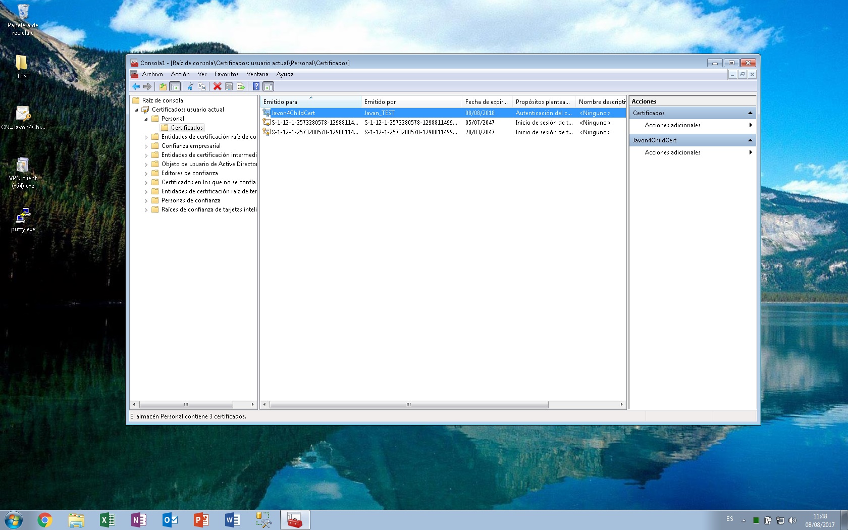 Podíamos comprobar que ambos procesos se realizaron correctamente invocando una consola de administración para ver los certificados “del usuario”: