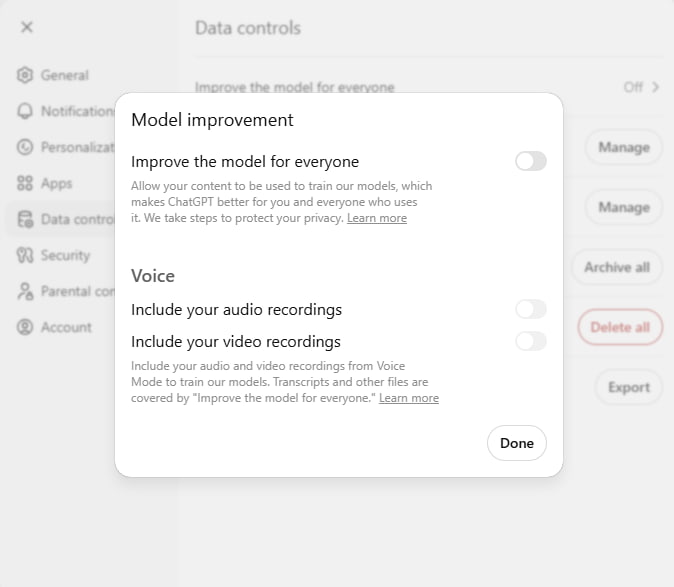 1. Go to Settings → Privacy or Data and disable “Use my data to train models.”
