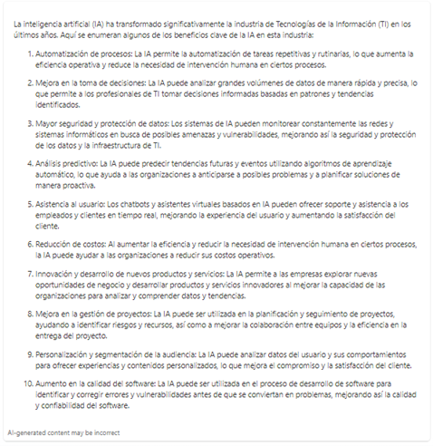 Prompt con menos tokens: "Enumera beneficios de la inteligencia artificial en la industria de TI"