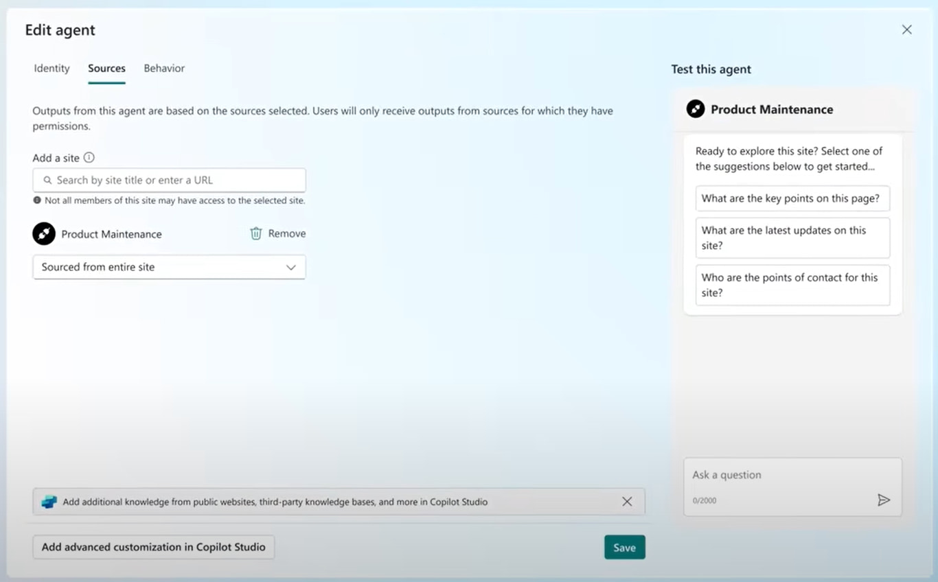 - Interacción con Agentes de IA: Cada sitio de SharePoint incluye un "agente listo" que permite a los usuarios chatear sobre el contenido del sitio. Los agentes pueden responder preguntas, resumir documentos y facilitar la comprensión del contenido, lo que simplifica el acceso a la información.